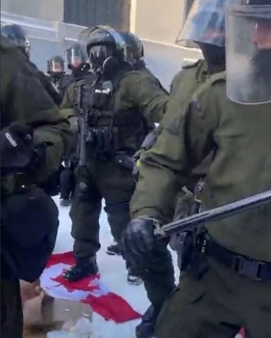 Here’s a compilation of clips showing some of the brutality of local police. Some of these police appear to be from Ottawa, while other videos show what appear to be UN troops, which are dressed in olive drab green. They both appear to be attempting to achieve the same goal: Government-sponsored terrorism against innocent, peaceful protesters.