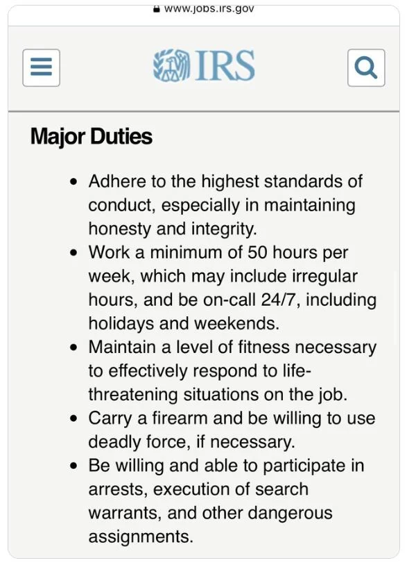 A recent job posting on USAjobs.gov listed the “Major Duties” of the new IRS employees as including a willingness to use “deadly force” to fire upon American citizens and kill them.