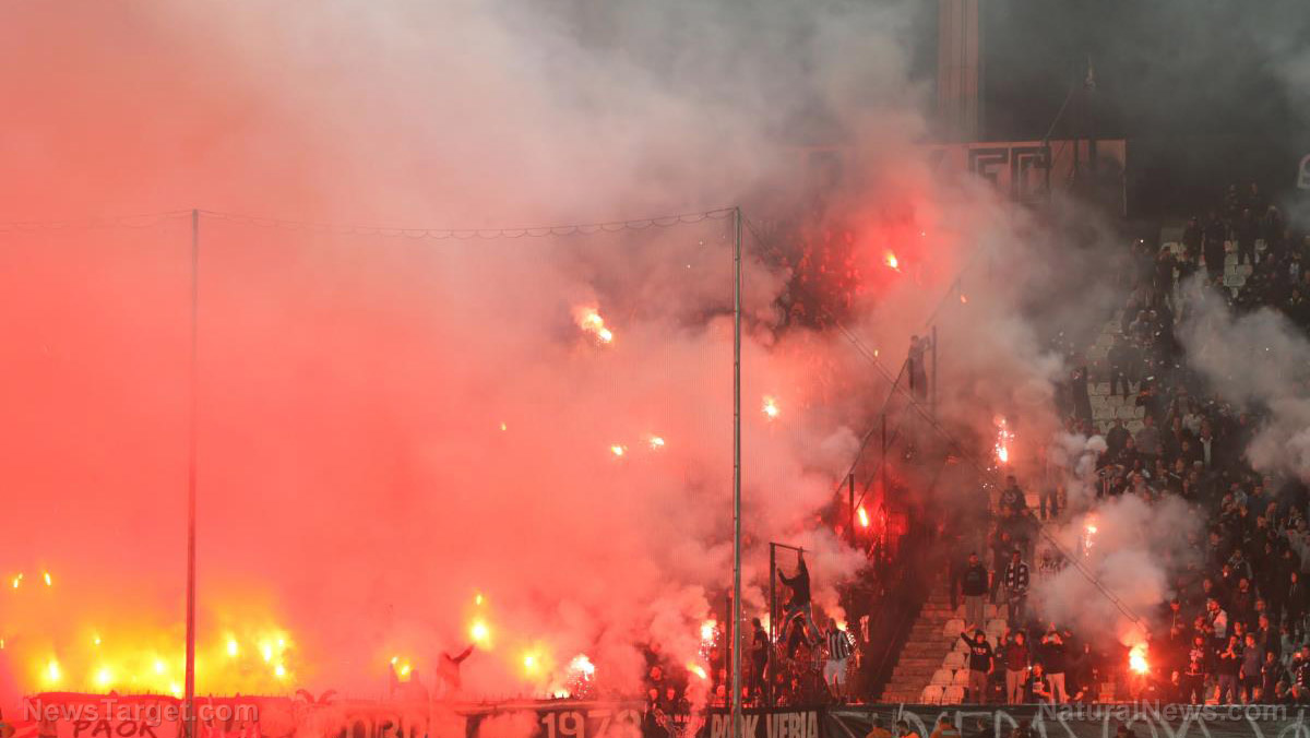 A video shared on social media showed the fans on the field were immediately encountered by baton-wielding police with riot shields. (Related: Antifa throws Molotov cocktails at police during a riot in Portland)